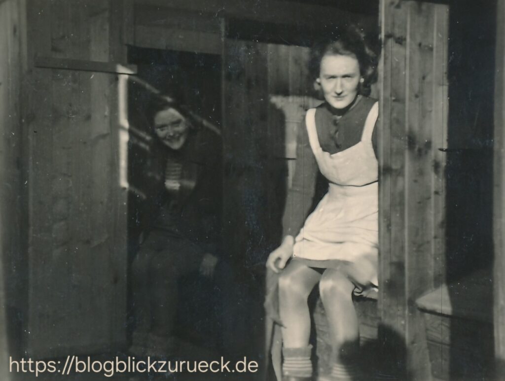 Für den Fotografen haben die Frauen das einfach verglaste Fenster der Baracke geöffnet, obwohl die Eiszapfen am Dach verraten, das es eisig kalt gewesen sein muß. Überhaupt machen mir die Holzhäuser in Fertigbauweise den Eindruck, als wären sie nicht besonders gut isoliert gewesen. Vermutlich mußte man in den Wintermonaten permanent heizen, um die Räume halbwegs warm zu bekommen. (Beitrag vom 15.02.2025)